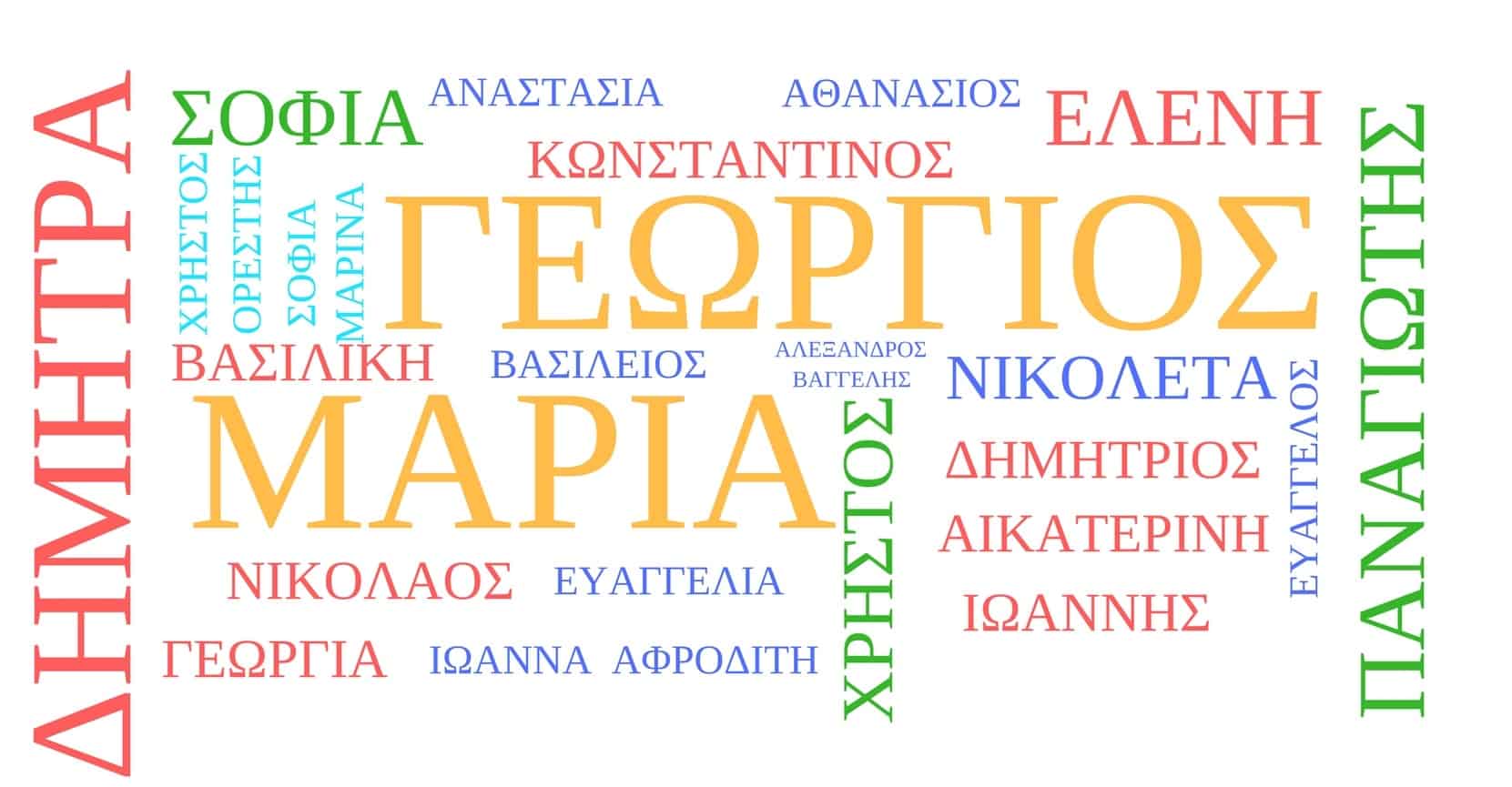 Myślę, że na podstawie powyższych wyjaśnień wiadomo już, dlaczego połowa Greków nosi identyczne imiona. Do najpopularniejszych greckich imion męskich należą: Γιώργος (Jorgos), Γιάννης (Janis), Κωνσταντίνος (Konstantinos, w skrócie Κώστας – Kostas), Δημήτρης (Dimitris) i Νικόλαος (Nikolaos) lub Νίκος (Nikos). Obliczono, że ok. 10% mężczyzn w Grecji ma na imię właśnie Jorgos. Najpopularniejszymi żeńskimi imionami są Μαρία (Marija), Ελένη (Eleni), Βασιλική (Wasiliki) i Κατερίνα (Katerina). Podobnie, jak w przypadku Jorgosa, ok. 10% kobiet w Grecji nosi imię Marija.