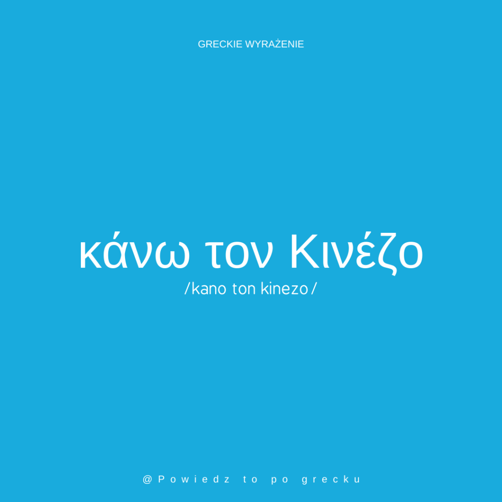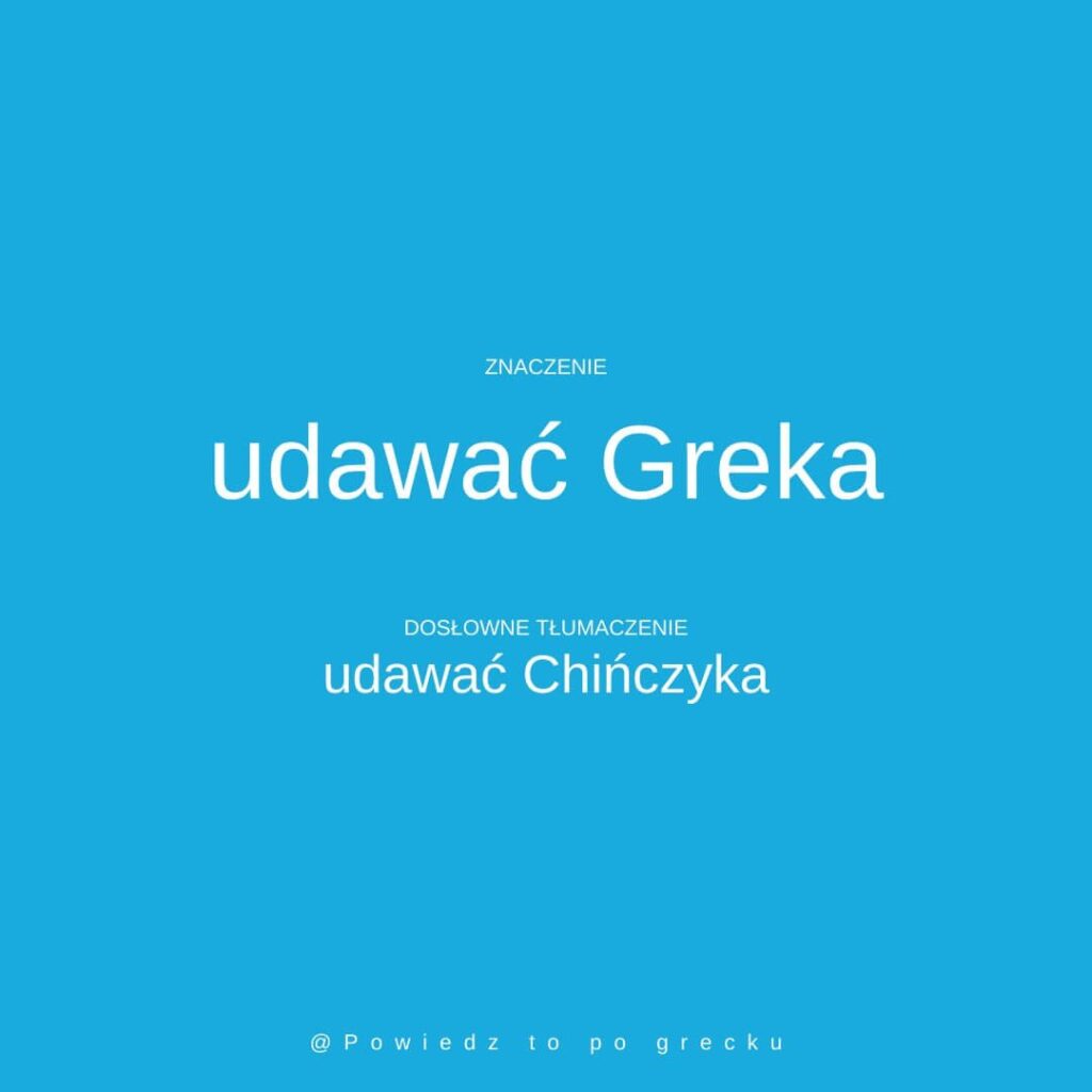 Grecy, gdy udają, że czegoś nie rozumieją, mówią κάνω τον Κινέζο, czyli udawać Chińczyka. Jest to odpowiednik polskiego wyrażenia „udawać Greka”. Wyrażenie to wzięło się stąd, że Chińczycy (według Greków) mają poważną, kamienną twarz (είναι ανέκφραστοι, czyli mają twarz bez wyrazu) i trudno zrozumieć, co myślą. Dawniej istniało też wyrażenie κάνω τον Γερμανό, czyli udawać Niemca, ponieważ Niemcy w czasie okupacji byli poważni i bez wyrazu. Dzisiaj ten ostatni zwrot jest rzadko używany (głównie przez starsze pokolenie).