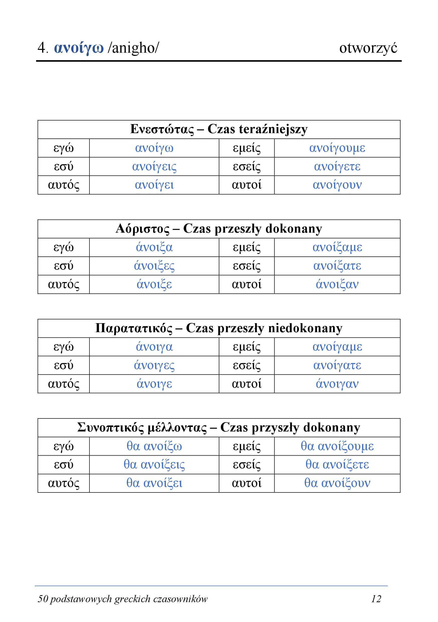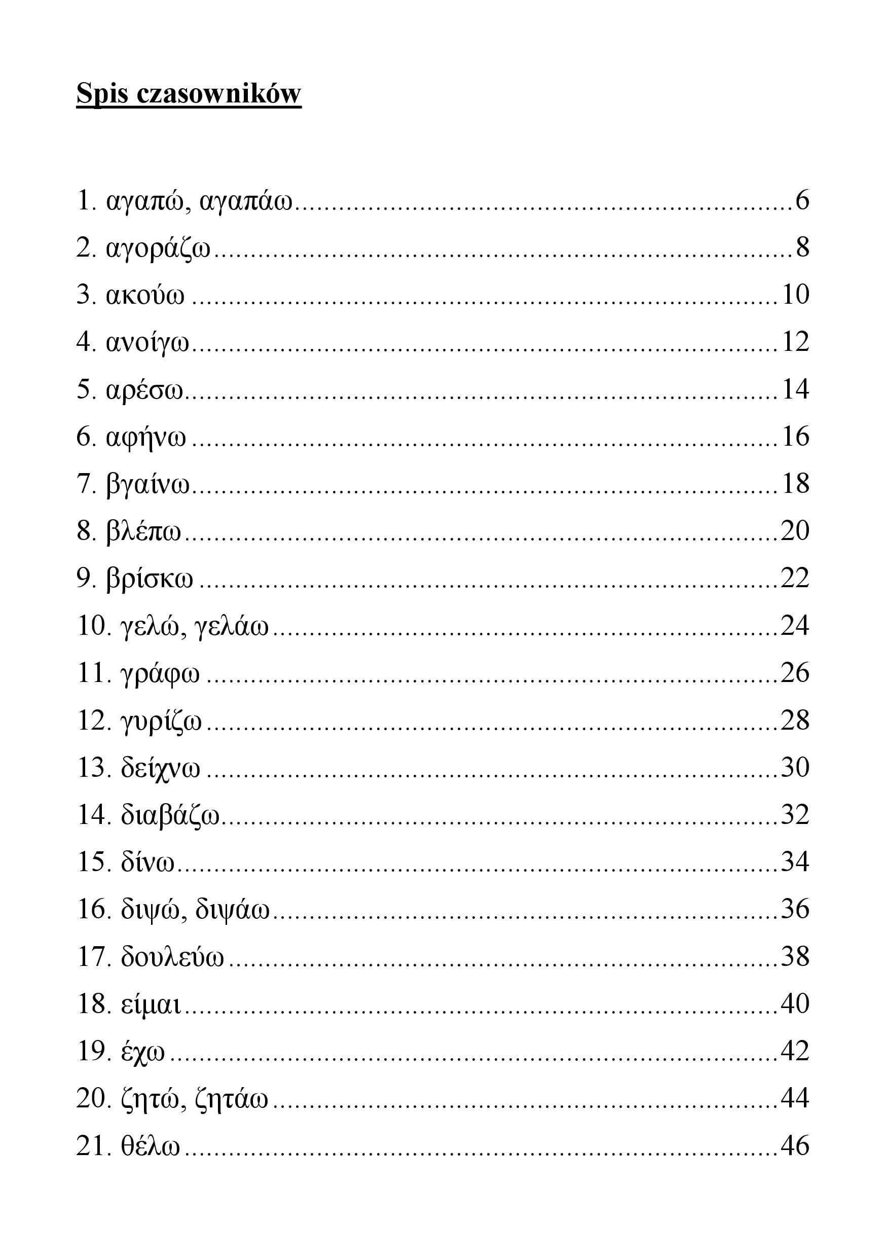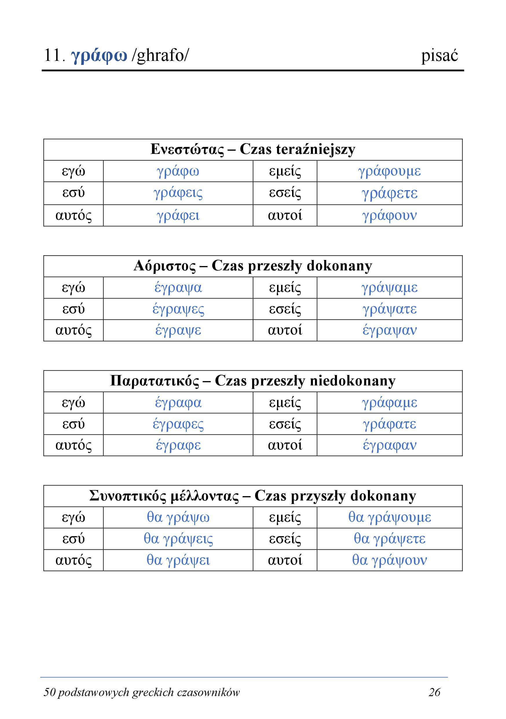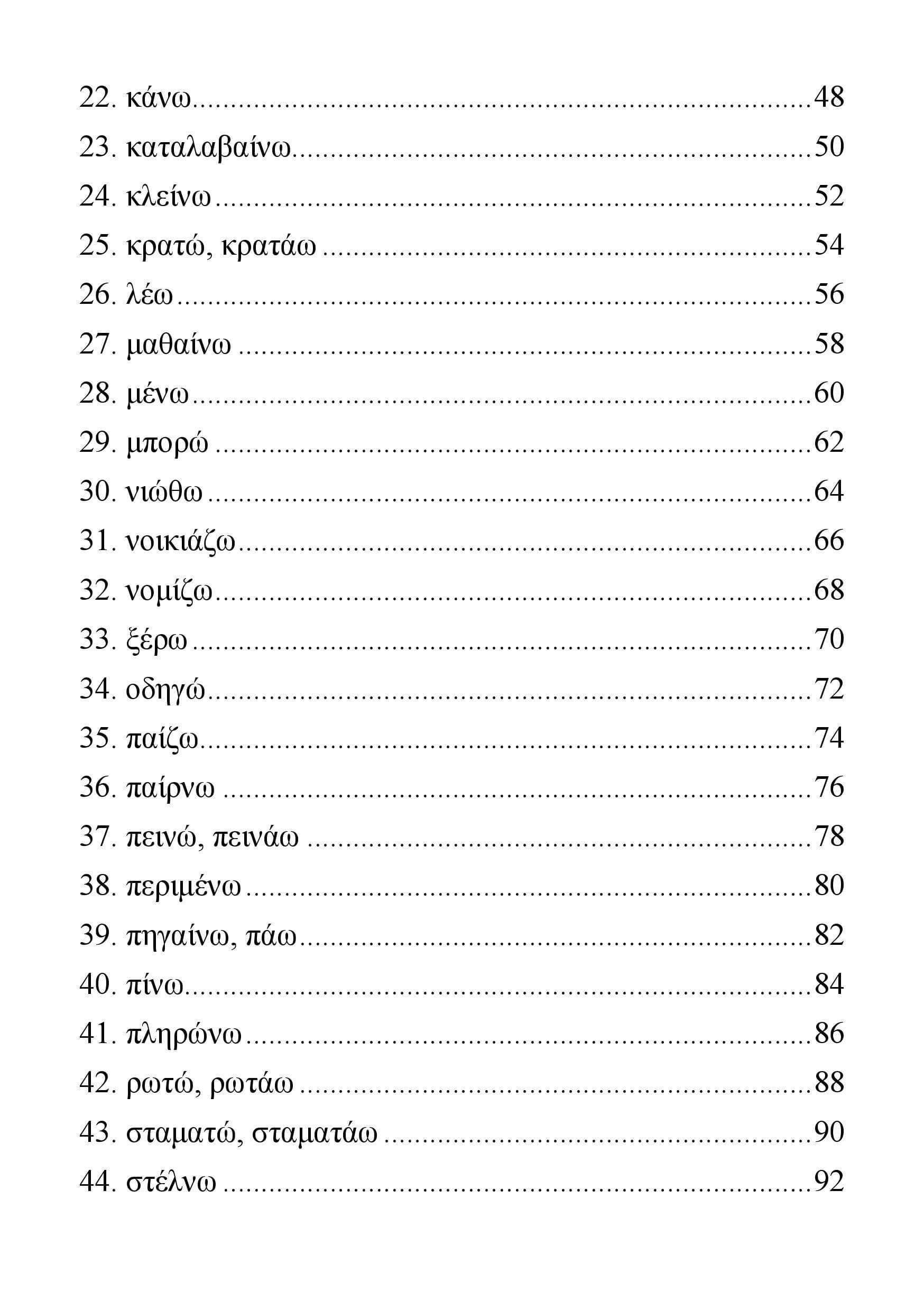 Czasowniki zostały odmienione przez następujące czasy: teraźniejszy (ενεστώτας), przeszły dokonany (αόριστος), przeszły niedokonany (παρατατικός), przyszły dokonany (συνοπτικός μέλλοντας), przyszły dokonany (εξακολουθητικός μέλλοντας) oraz tryb rozkazujący (προστακτική). Nie zostały natomiast uwzględnione czasy typu perfect, które nie są niezbędne na początku nauki języka greckiego.