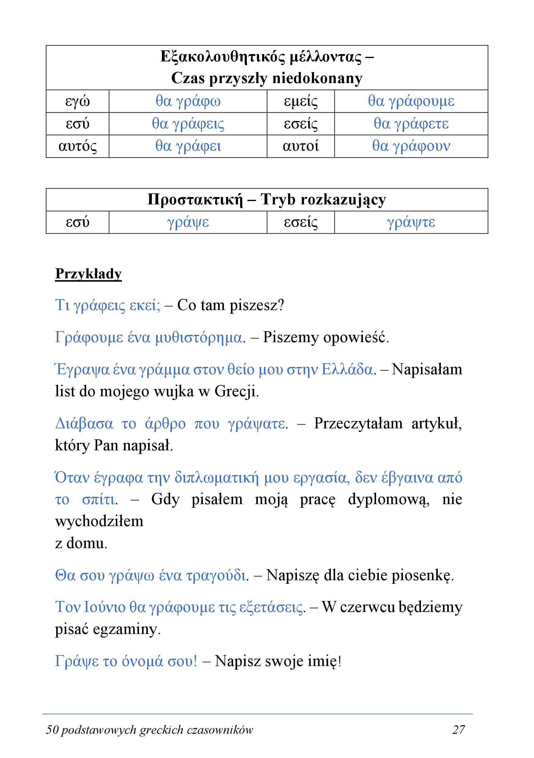 E-book „50 podstawowych greckich czasowników z odmianą w czasie teraźniejszym, przeszłym i przyszłym” to jedyny na polskim rynku materiał poświęcony greckim czasownikom. Przeznaczony jest dla osób początkujących, które potrzebują przejrzystego wzoru odmiany czasowników wraz z przykładami ich użycia.