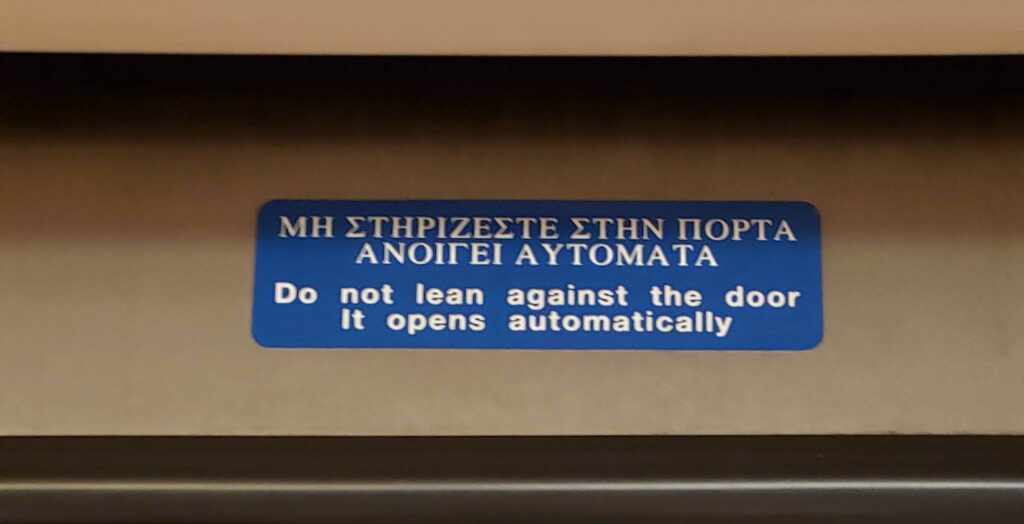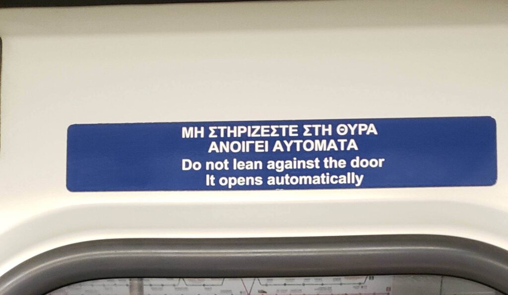 Przykład użycia dwóch wyrazów o tym samym znaczeniu w tym samym kontekście. Po lewej wyraz zapożyczony z włoskiego, po prawej – wyraz grecki. Zdjęcia zrobione w metrze w Atenach.